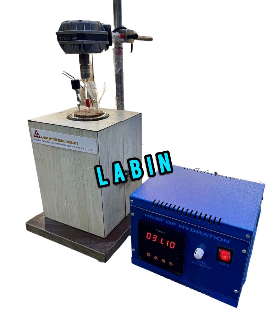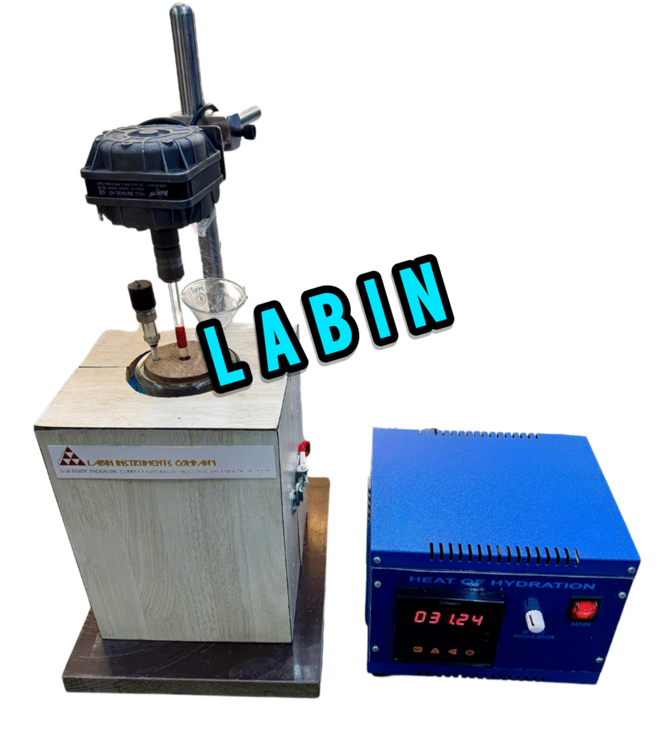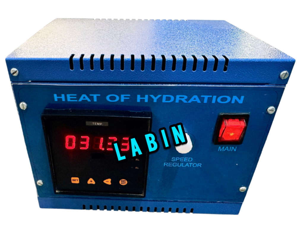 Heat of Hydration apparatus is used for determining heat of hydration of cements by measuring difference between heat of solution of dry cement and heat of solution of a separate sample partially hydrated for 7 days & 28 days. Constant-speed stirrer maintains uniform temperature throughout liquid and supplies sufficient agitation to keep solid reactant suspended in the acid mixture. This equipment consists of insulated wood case,vacuum jar with stopper; digital thermometer (least count 0.1 degree) plus holder, glassfunnel; stirring paddle and chuck. The Equipment will work on 220-240 V, AC 50 Hz Single Phase.